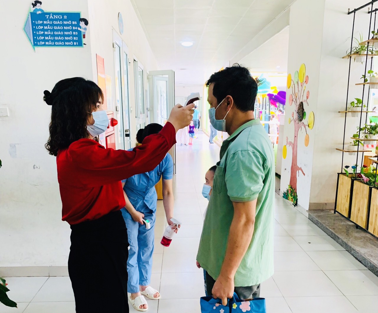 Ở phía cổng trường, các chú công an cùng CBGVNV nhà trường đã hướng dẫn phụ huynh vị trí để xe và di chuyển tới các điểm đo nhiệt độ. Nhà trường có 3 điểm đo nhiệt độ được phân chia theo vị lớp học. Sơ đồ lớp học và phân chia các điểm đo nhiệt độ đã được nhà trường đăng tải trên cổng TTĐT, được các cô giáo chia sẻ trên zalo nhóm lớp và trong buổi họp phụ huynh trực tuyến trước ngày trẻ quay trở lại trường. Tại các điểm đo nhiệt độ, phụ huynh và trẻ xếp hàng theo vạch kẻ nhà trường hướng dẫn, phụ huynh được đo nhiệt độ và sát khuẩn tay trước khi lên lớp. Tại các lớp học, cô giáo cho trẻ đo nhiệt độ, sát khuẩn tay, trẻ chào cô giáo và ông bà bố mẹ trước khi vào lớp.