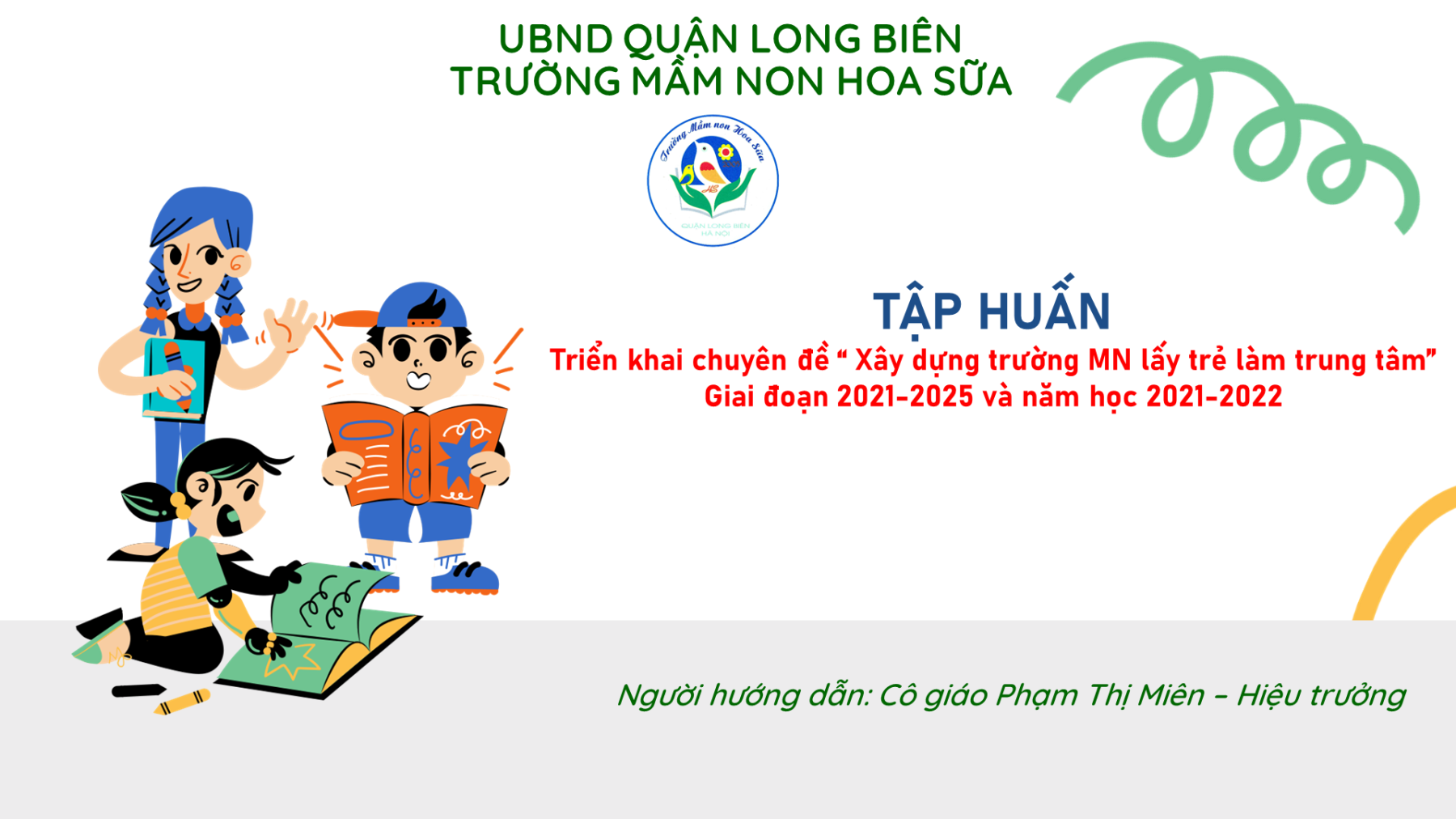 Sau khi nghe ý kiến đóng góp của CBGVNV nhà trường, cô giáo Phạm Thị Miên đã giải đáp các thắc mắc, đưa ra định hướng của nhà trường nhằm triển khai chuyên đề, phân công nhiệm vụ rõ ràng cho từng bộ phận, từng thành viên để thực hiện có hiệu quả chuyên đề " Xây dựng trường mầm non lấy trẻ làm trung tâm giai đoạn 2021-2025 và năm học 2021-2022". Nhà trường đã xây dựng kế hoạch thực hiện chuyên đề, mô hình nhóm, lớp điểm về xây dựng trường mầm non lấy trẻ làm trung tâm và triển khai thực hiện tại các nhóm, lớp (Mỗi độ tuổi 01 nhóm, lớp cụ thể: Lớp MGB C2; Lớp MGN B4; Lớp MGLA5) và dự kiến năm tiếp theo sẽ nhân rộng 6 lớp điểm ở tất cả các lĩnh vực. Nhà trường làm điểm cấp quận lĩnh vực KPKH, dự kiến xây dựng 3 hoạt động điểm kiến tâp vào tháng 3/2022 (giao nhiệm vụ cho lớp A2 Đ/c Hằng; Lớp B4 Đ/c Thu; Lớp C2 Đ/c Tuyết).