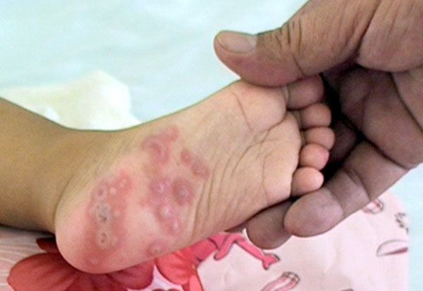BS Trần Thị Việt (trưởng khoa nhiễm, BV Nhi Đồng 2): Triệu chứng của trẻ mắc bệnh tay - chân - miệng thường là sốt, nổi bóng nước hồng ban ở lòng bàn tay, chân, mông, đầu gối và có vết loét trong miệng. Bệnh này diễn biến bất thường và chia ra bốn giai đoạn: không biến chứng, biến chứng nhẹ, biến chứng nặng và biến chứng rất nặng. Một số trường hợp chỉ cần điều trị tại nhà.