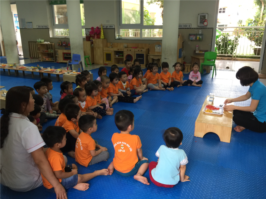 Mỏ đầu cho buổi hoạt động, các con đã được cô kể về lợi ích của việc ăn hoa quả rất tốt cho sức khỏe và giúp cho cơ thể khỏe mạnh hơn. Từ các loại quả như: dưa hấu, táo,xoài, thanh long và kèm thêm sữa tươi, sữa chua và sữa đặc, các cô giáo đã chế biến ra 1 món ăn lạ khiến các bạn nhỏ rất tò mò và không biết cô sẽ làm gì từ những thực phẩm đó. Các bạn nhỏ chăm chú khi nghe cô nói lên các bước để làm nên món “Hoa quả dầm” thơm ngon và béo ngậy: