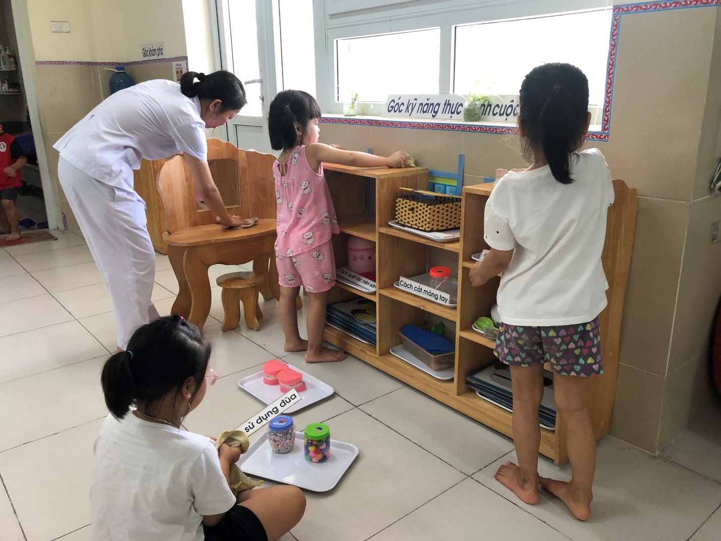 Trong cá !important;c giờ học như hoạt động ngoài trời, hoạt động góc, hoạt động học… ngoài việc tổ chức cho trẻ thu dọn dụng cụ học tập, lau dọn các góc chơi, các cô còn tổ chức cho trẻ nhặt rác ở bồn hoa, tưới cây, lau lá ở góc thiên nhiên của lớp và lau dọn vệ sinh lớp