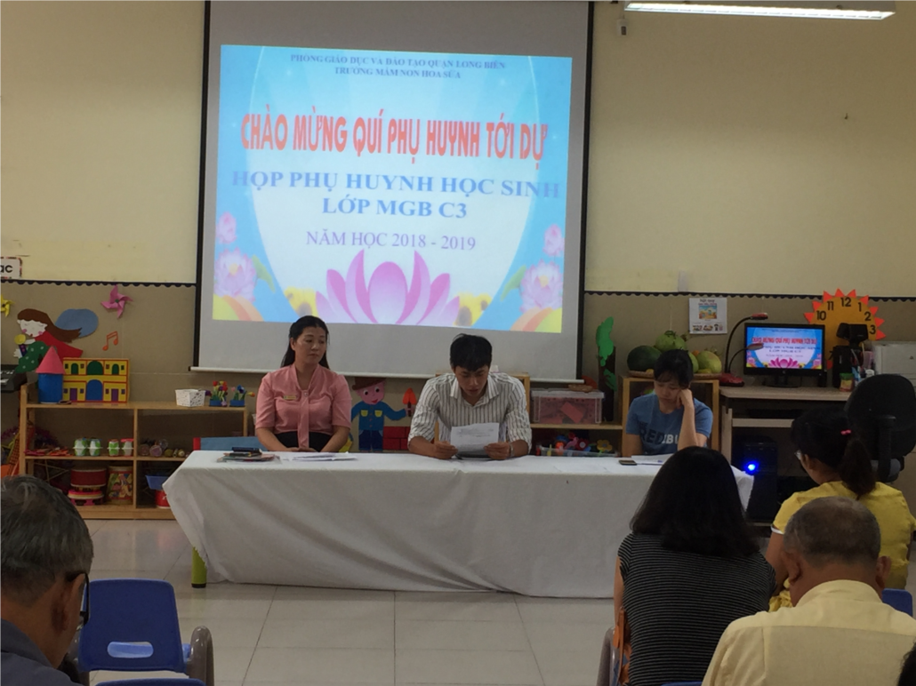 Buổi họp bắt đầu lúc 8h 30 phút khi mà phụ hunh đã đến khá đầy đủ. Một điều làm ai nấy đều vui vẻ khi nghe cô giáo nói rằng: “Năm học này, các vị phụ huynh đều rất quan tâm đến con em của mình, vì yêu thương con nên các bậc cha mẹ thường xuyên liên lạc, trò chuyện với cô giáo trong mỗi lần đón đưa con. Điều này ít nhiều đã giúp cho giáo viên hiểu hơn đặc điểm tâm lí của từng cháu, bước đầu đã tạo thuận lợi trong việc giáo dục cháu”. Bên cạnh đó, giáo viên chủ nhiệm cũng lập một nhóm zalo của lớp để cùng phụ huynh trao đổi phối hợp trong công tác chăm sóc và giáo dục các con.Cô giáo nói đến đó, gương mặt phụ huynh nào cũng phấn khởi. Vì giáo dục luôn cần sự hợp tác ngay từ đầu giữa gia đình và nhà trường.
