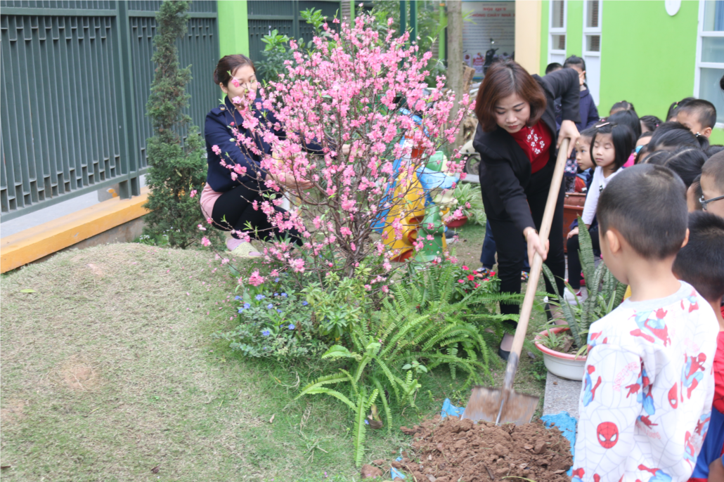 cô giáo và các bác cũng tham gia trồng cây tại sân