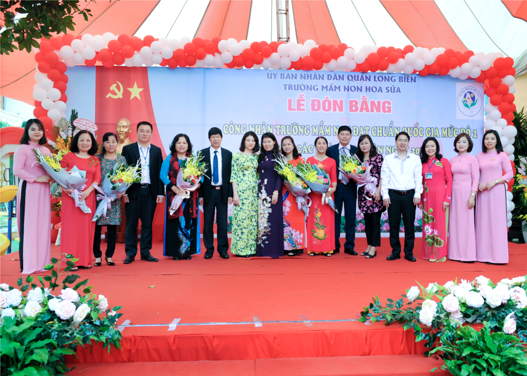 Sau phần chào cờ, tuyên bố lý do, giới thiệu đại biểu nhà giáo ưu tú Trần Thị Thanh – Bí thư chi bộ - Hiệu trưởng nhà trường đọc báo cáo quá trình xây dựng trường mầm non Hoa Sữa đạt chuẩn Quốc Gia mức độ 2. Đ/c Ngô Thị Hoa – Phó trưởng phòng GD&ĐT Quận trao bằng công nhận trường chuẩn Quốc Gia và tặng hoa chúc mừng nhà trường. Các đồng chí lãnh đạo phường Sài Đồng, các đồng chí ban đại diện cha mẹ học sinh chúc mừng thành tích của tập thể CBGVNV nhà trường.
