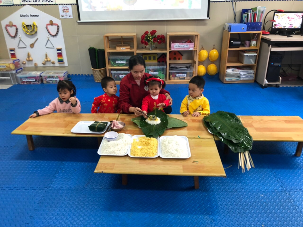 Hòa chung vào không khí đón tết,hôm nay các bé lớp mẫu giáo bé c2 được trải nghiệm gói bánh chưng. Dưới sự hướng dẫn của cac cô giáo các bé biết được tự tay gói những chiếc bánh chưng xanh,các bé biết được làm ra chiếc bánh chưng cần có những nguyên liệu như gạo nếp,thịt lợn,đỗ xanh và không thể thiếu là lá dong .Nhìn các bạn nhỏ hào hứng để gói bánh chưng các cô rất vui, từ đó giáo dục các bé biết và nhớ về ngày tết cổ truyền của dân tộc.