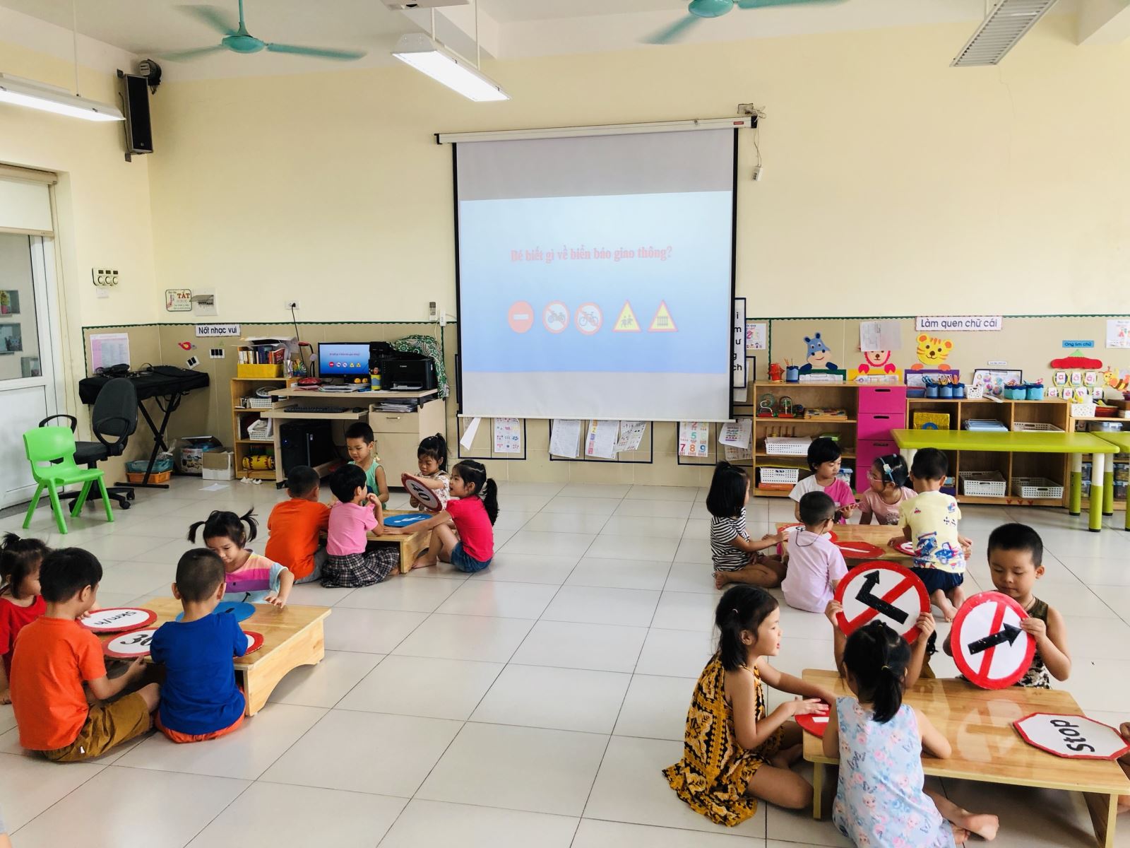 Ngoài ra các bạn nhỏ còn được tìm hiểu về nhiều biển báo khác nhau . Cuối giờ học cô cho các bạn về nhóm tìm hiểu các biển báo giao thông vừa học và còn được trải nghiệm đóng vai làm người điều khiển các phương tiện giao thông đường bộ. Các con hứng thú với bài học đầy bổ ích, bạn nào cũng hăng hái tham gia xây dựng bài.
