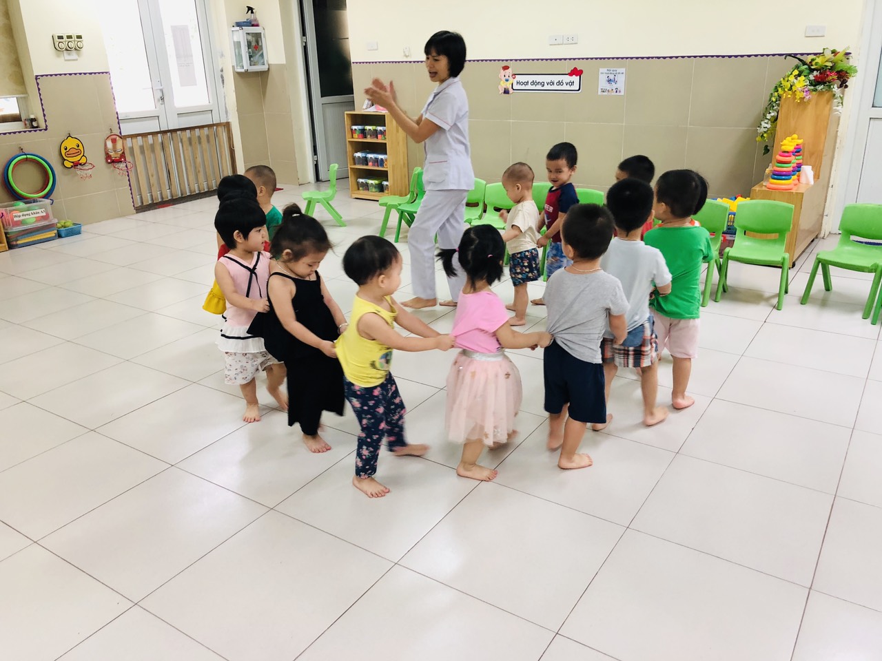 Để giúp các bé có được sự mạnh dạn, tự tin và tích cực hơn, các cô giáo dạy các bé lớp nhà trẻ đã áp dụng rất nhiều các bài tập thể chất, các trò chơi vận động vừa sức nhưng cũng không kém phần hấp dẫn. Điều này không những giúp bé phát triển được các vận động tinh, thô, mà bên cạnh đó các tố chất nhanh, mạnh, bền, khéo cũng được phát triển.