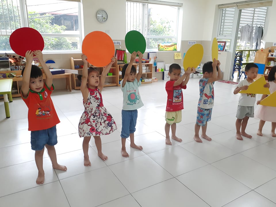 Sau khi được cô giới thiệu các hình qua ảnh minh họa, các con sẽ tìm trong lớp học các đồ dùng có hình cô yêu cầu. Các con cảm thấy thích thú khi tham gia trò chơi này vì các con khám phá ra rằng các hình trên đều gắn liền với cuộc sống hàng ngày, các con có thể dễ dàng bắt gặp ở khắp mọi nơi xung quanh mình. Các con thấy kỳ diệu làm sao khi biết các bánh xe đồ chơi có hình tròn, đồng hồ treo tường có hình tam giác ….