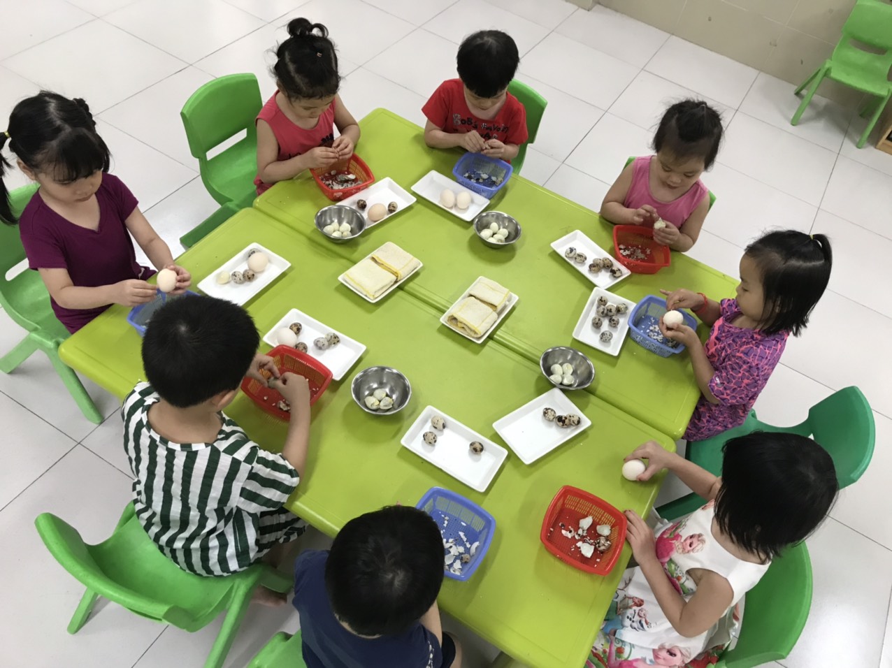 ⭐️Những quả trứng đã được các đầu bếp siêu nhí "bóc" rất nhanh để chuẩn bị bữa cơm trưa với món “ Thịt kho trứng cút” đấy ạ.