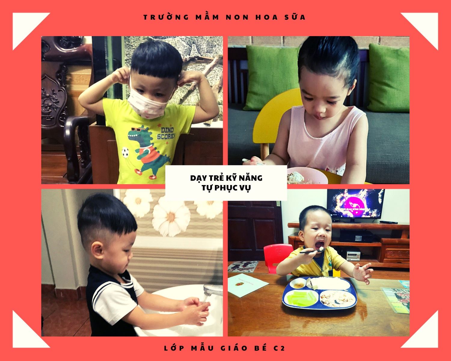 Việc dạy trẻ kỹ năng tự phục vụ là vô cùng cần thiết, đặc biệt là đối với trẻ ở lứa tuổi mầm non. Đây là giai đoạn quan trọng để gíúp trẻ có những kỹ năng sống cơ bản, là phương tiện cần thiết để giúp trẻ hội nhập, chủ động, sáng tạo, tự tin vững vàng trước mọi khó khăn thử thách của cuộc sống. Nhận thức được điều đó Trường mầm non Hoa Sữa nói chung và giáo viên lớp Mẫu giáo Bé C2 nói riêng luôn quan tâm đến việc dạy và ôn tập cho học sinh những kỹ năng theo đúng độ tuổi.