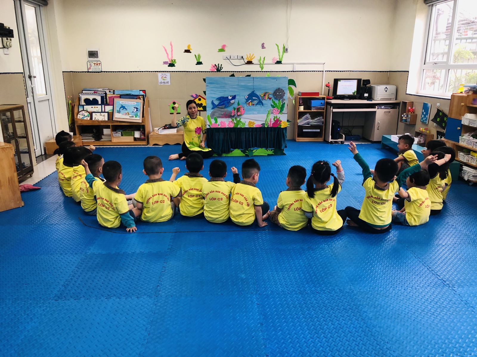 Cô giáo dẫn dắt trẻ đến với câu chuyện “Đai dương mùa covid ”. Đây là một câu chuyện do cô giáo tự sáng tác với nội dung kể về các nhân vật dưới lòng đại dương. Các con vật đưa ra các ý kiến để PCDB Covid-19, với các hình thức thể hiện khác nhau như kể chuyện thao tranh, kể chuyện bằng đèn pin chiếu bóng, bạn nào cũng đều háo hức để lắng nghe câu chuyện.
