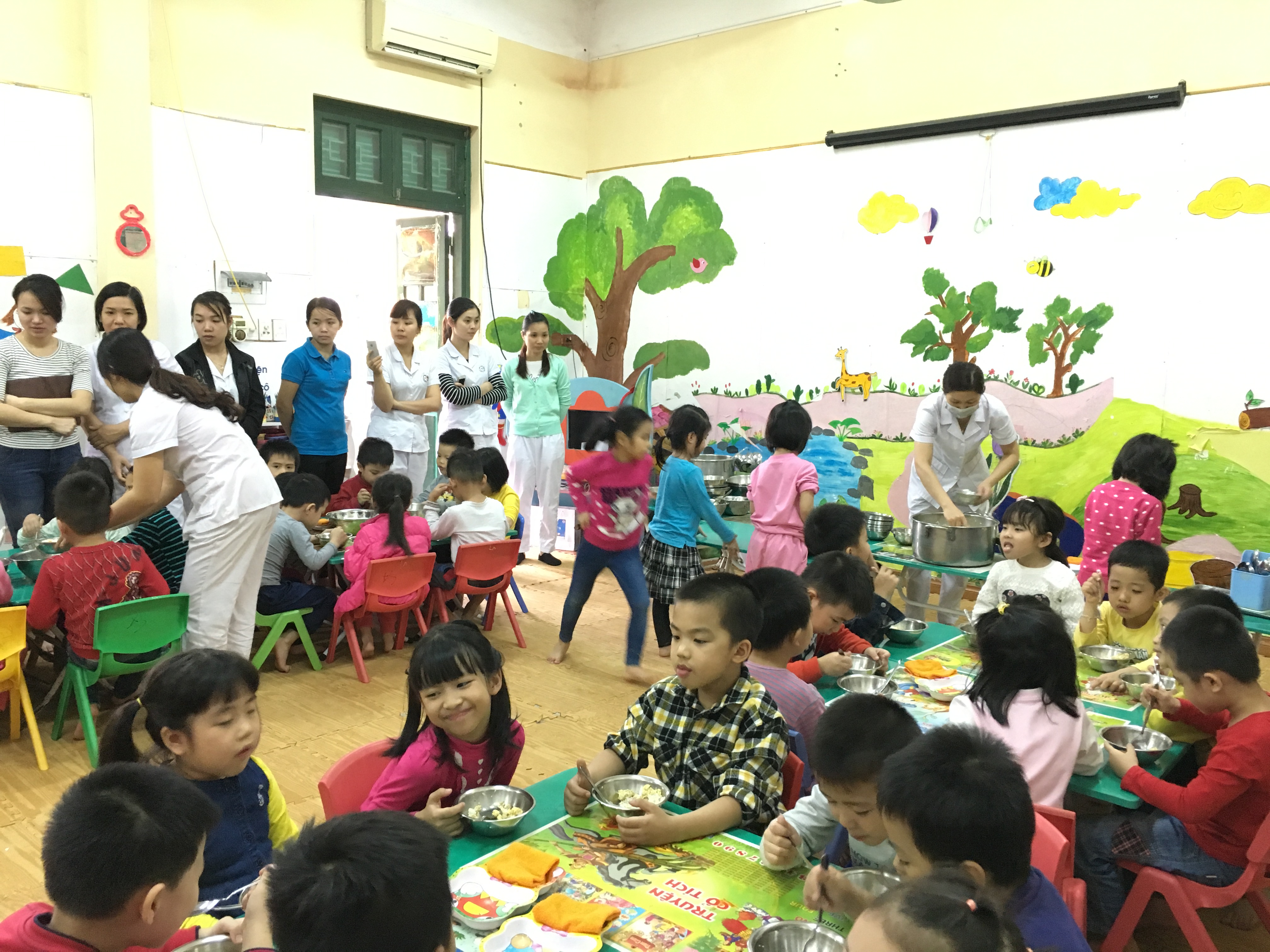 Giáo viên ở tất cả các khối lớp được tham dự quy trình giờ ăn: từ lúc chuẩn bị, chia ăn, trong giờ ăn và sau khi ăn. Các cô giáo trong lớp đã thực hiện sự phân công và phối hợp với nhau trong việc thực hiện dây chuyền rất linh hoạt, khoa học trong hướng dẫn và chắm sóc trẻ chu đáo.