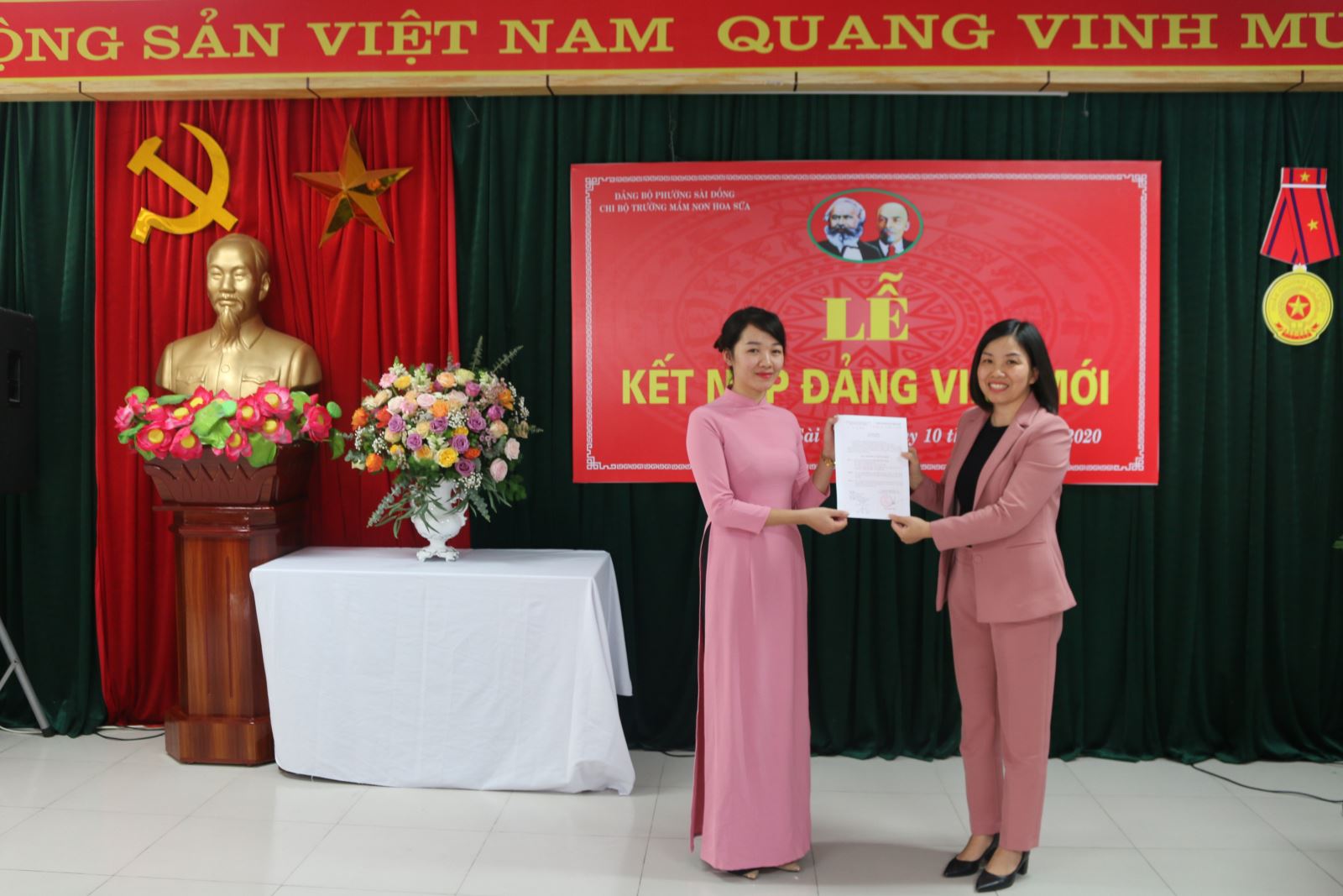 Sau một thời gian phấn đấu, rèn luyện và tu dưỡng. Được sự giúp đỡ của tập thể giáo viên, đồng thời sự uốn nắn dìu dắt của chi bộ trường mầm non Hoa Sữa. Được sự đồng ý của Đảng uỷ Phường Sài Đồng, chi bộ trường mầm non Hoa Sữa long trọng tổ chức Lễ kết nạp đảng viên mới cho 02 quần chúng ưu tú: Nguyễn Thị Hạnh, Nguyễn Thị Thu Thảo vào Đảng cộng sản Việt Nam