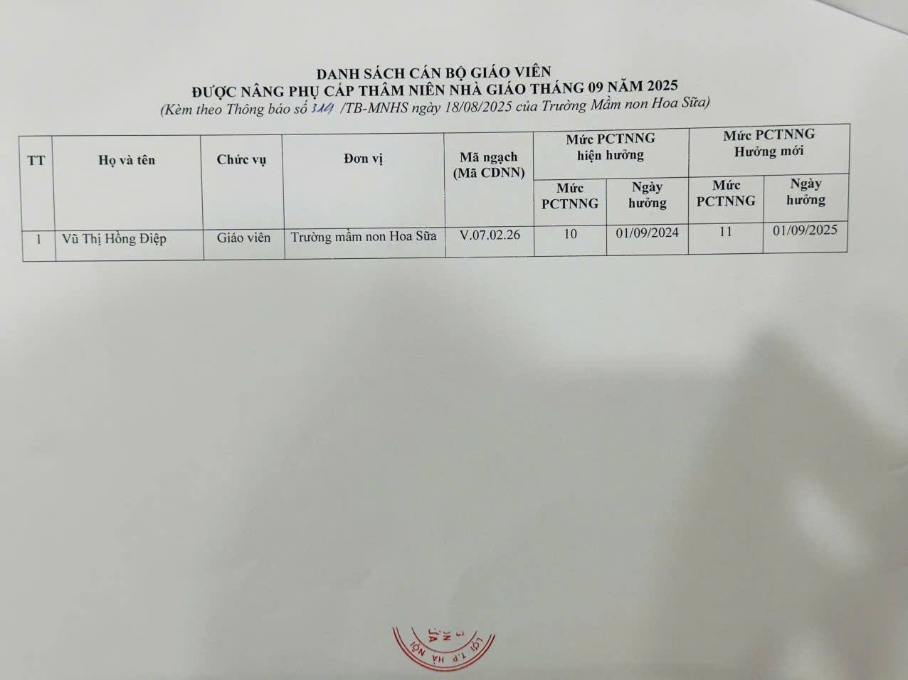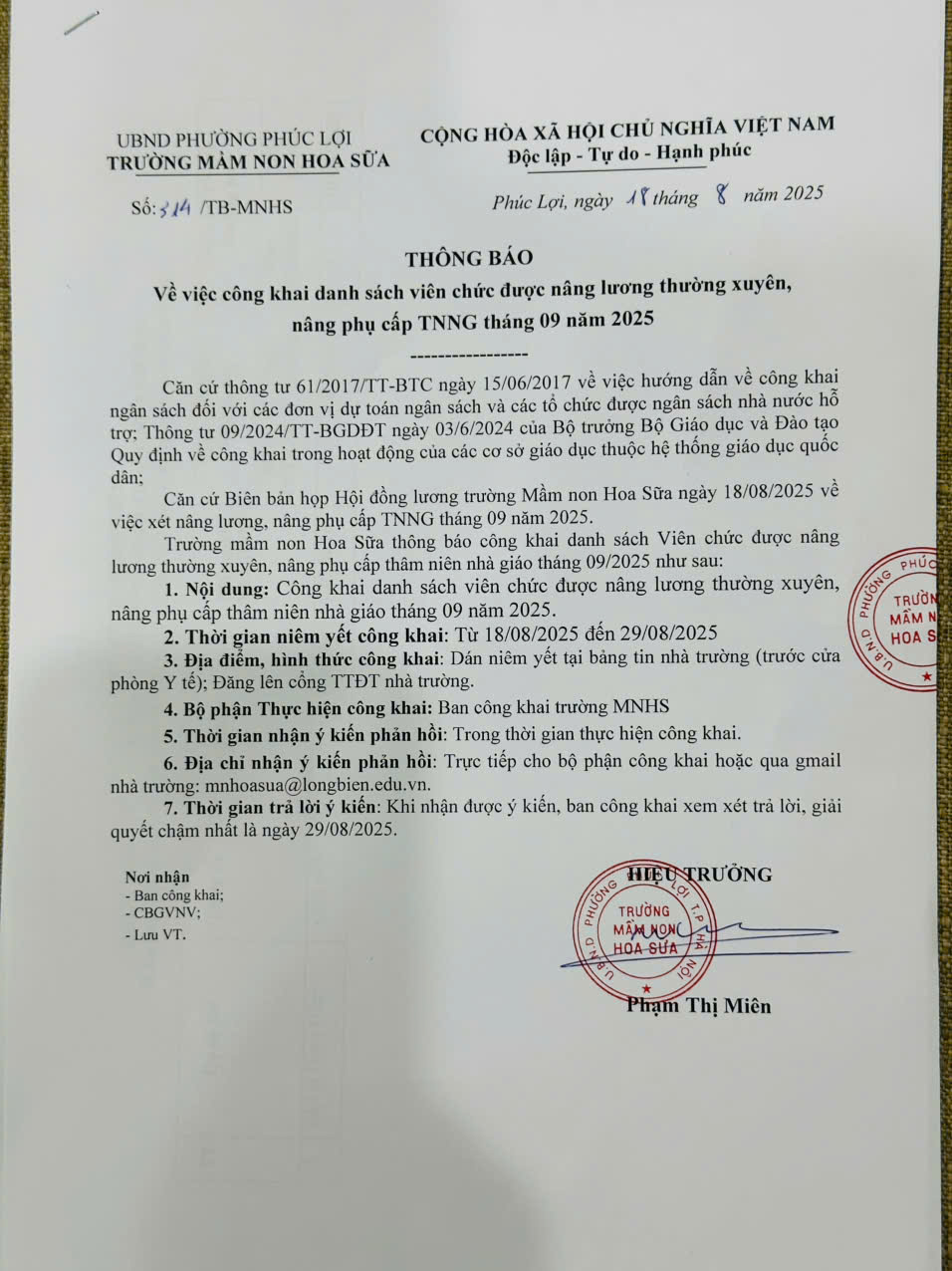 Chuyên mục: Nâng lương thường xuyên + PCTN nhà giáo Số Văn bản: 27/TB-MNHS Phòng ban: Hiệu trưởng Phạm Thị Miên