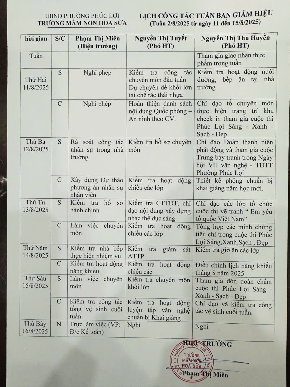 | Lịch tuần | Quyết định, kế hoạch, biên bản | Trường MN Hoa Sữa | 11-08-2025 |