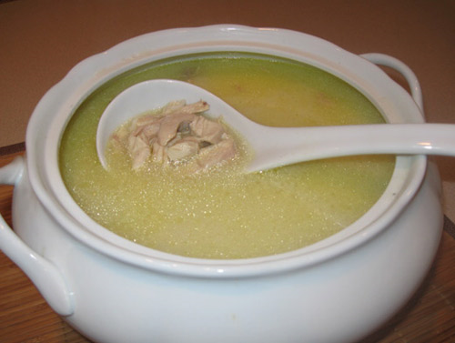 hầm mềm khoảng 20 phút; sau đó cho giá vào, tắt lửa ngay. Sau khi múc
