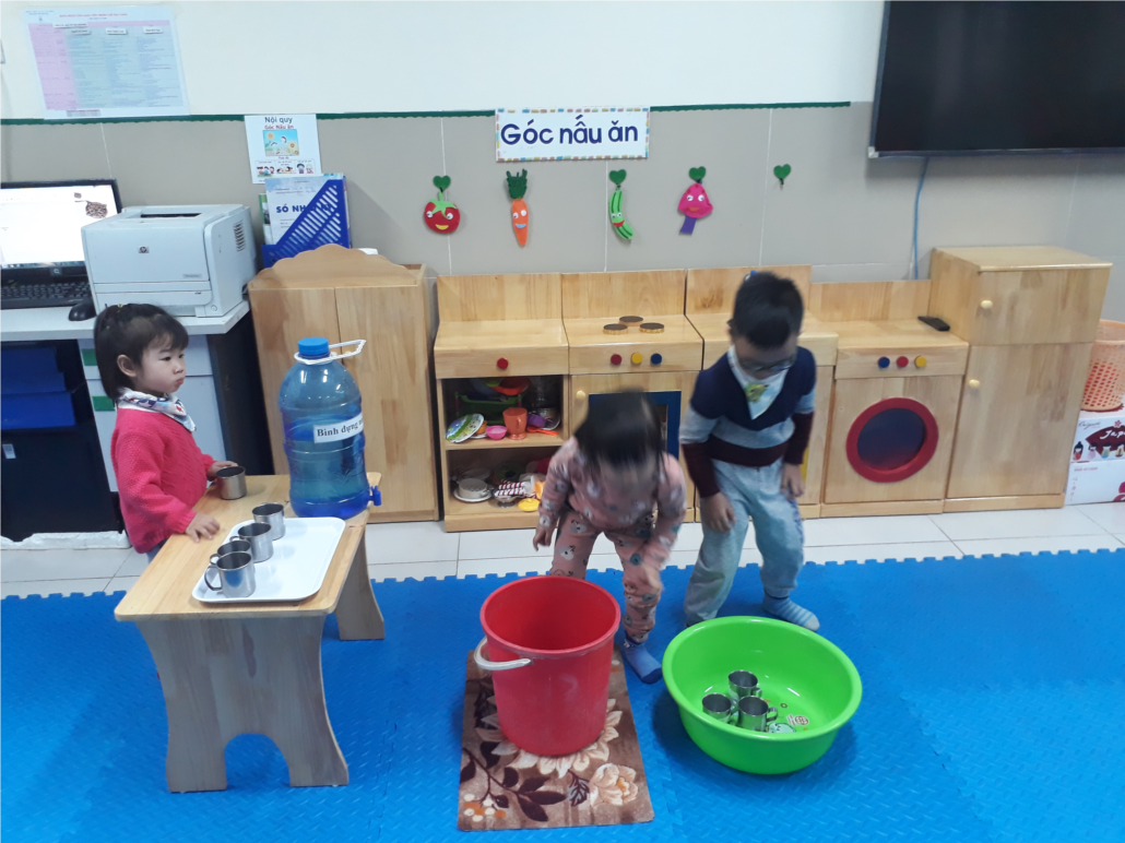 Hằng ngày các bạn nhỏ lớp mẫu giáo bé C4 đều được thực hành kỹ năng xúc miệng bằng nước muối. Các bạn ấy đã biết cách rót nước, ngậm một ngụm nước vừa phải, xúc trong miệng để xúc sạch cổ họng. xúc xong sẽ nhổ vào xô và để cốc đã sử dụng vào thùng chậu cho cô đấy.
