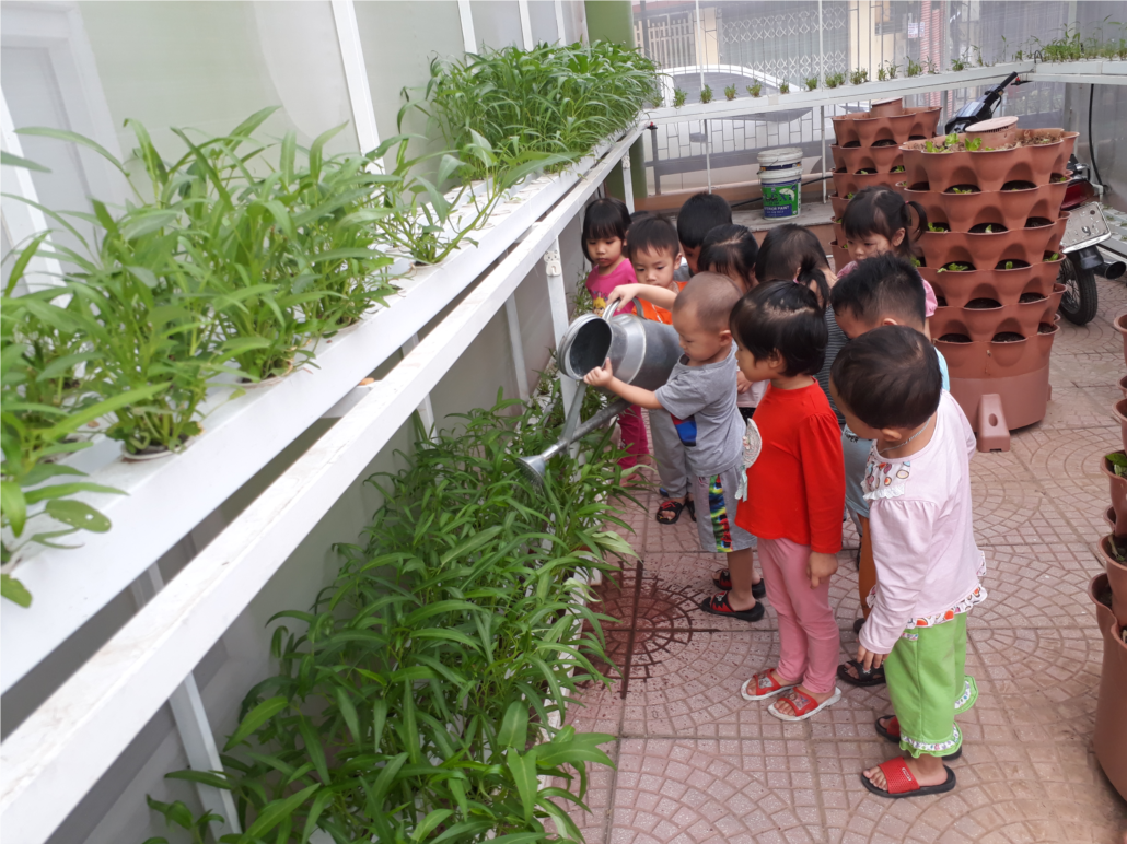 Vườn rau sạch còn giúp trẻ mầm non làm quen với thế giới thực vật sinh động qua các giờ học ngoài trời trực tiếp tham gia trồng, chăm sóc rau chứng kiến quá trình sinh trưởng phát triển của cây, hưởng thụ thành quả lao động của mình khiến vườn rau càng thêm ý nghĩa.