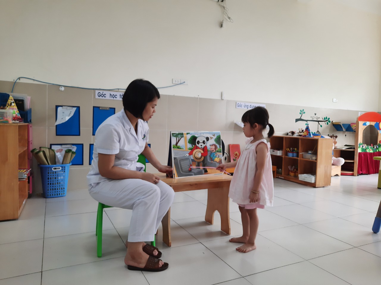 Để giúp trẻ hứng thú trước khi vào giờ học , cô giáo đưa ra câu đố và trẻ trả lời . Từ đó cô giáo dẫn dắt trẻ vào giờ học một cách tự nhiên , cô giới thiệu cho trẻ tên bài thơ “ Gấu con bị đau răng ” để trẻ biết bài học ngày hôm nay . Tiếp đến cô giáo đọc bài thơ cho trẻ nghe thể hiện cảm xúc bằng giọng đọc và khuôn mặt . Tất cả lớp ngồi yên lặng chú ý nghe từng câu thơ cô giáo đọc . Lần thứ 2 , cô giáo vừa đọc vừa kết hợp với tranh minh họa . Để giúp trẻ học thuộc bài thơ , cô giáo đã sử dụng những bức tranh sinh động , rõ nét để minh họa cho từng nội dung của bài thơ . Cũng từ những bức tranh đó cô giáo cùng trẻ tìm hiểu rõ hơn nội dung bài thơ cũng như từng câu thơ trong bài . Tiếp đến là phần trẻ đọc thơ , cô giáo cho trẻ đọc thơ theo các hình thức : Tổ , nhóm , cá nhân . Các bạn tự tin đọc thuộc thơ sẽ lên đọc cho các bạn nghe .