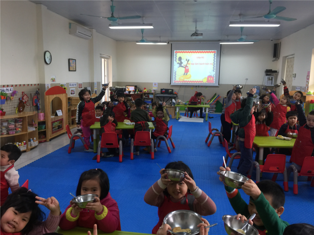 Trước khi vào làm bánh, bạn nào cũng nhanh chóng đi rửa tay thật sạch để đảm bảo vệ sinh trong lúc làm bánh. Các bạn cùng cô trò chuyện về các nguyên liệu và các bước để làm bánh. Tiếp theo là các bạn cùng thực hành, tự mình lấy nước, lấy bột, đường , sữa…