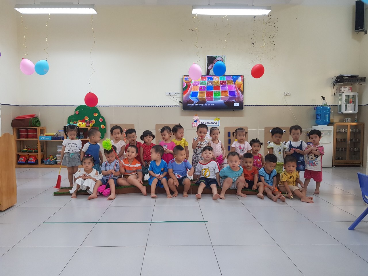Ngay từ sáng sớm, với cờ hoa trên tay, các bé được bố mẹ đưa đến lớp với niềm vui hân hoan, phấn khởi. Khai giảng năm nay chắc chắn sẽ để lại những ấn tượng và những cảm xúc khó quên cho các bậc phụ huynh những bé lứa tuổi nhà trẻ nói chung và phụ huynh các bé lớp D1 nói riêng, vì đây là khai giảng đầu tiên các con vui đón. Các bé cùng cô tiến hành buổi lễ chào cờ, hát Quốc ca và nghe cô đọc thư của chủ tịch nước. Thật vui khi được bác phụ huynh vào tặng quà và cùng nhau chụp những bức ảnh đáng yêu ,nhìn thấy các bạn chơi ở các góc chơi trông thật đáng yêu lam sao.