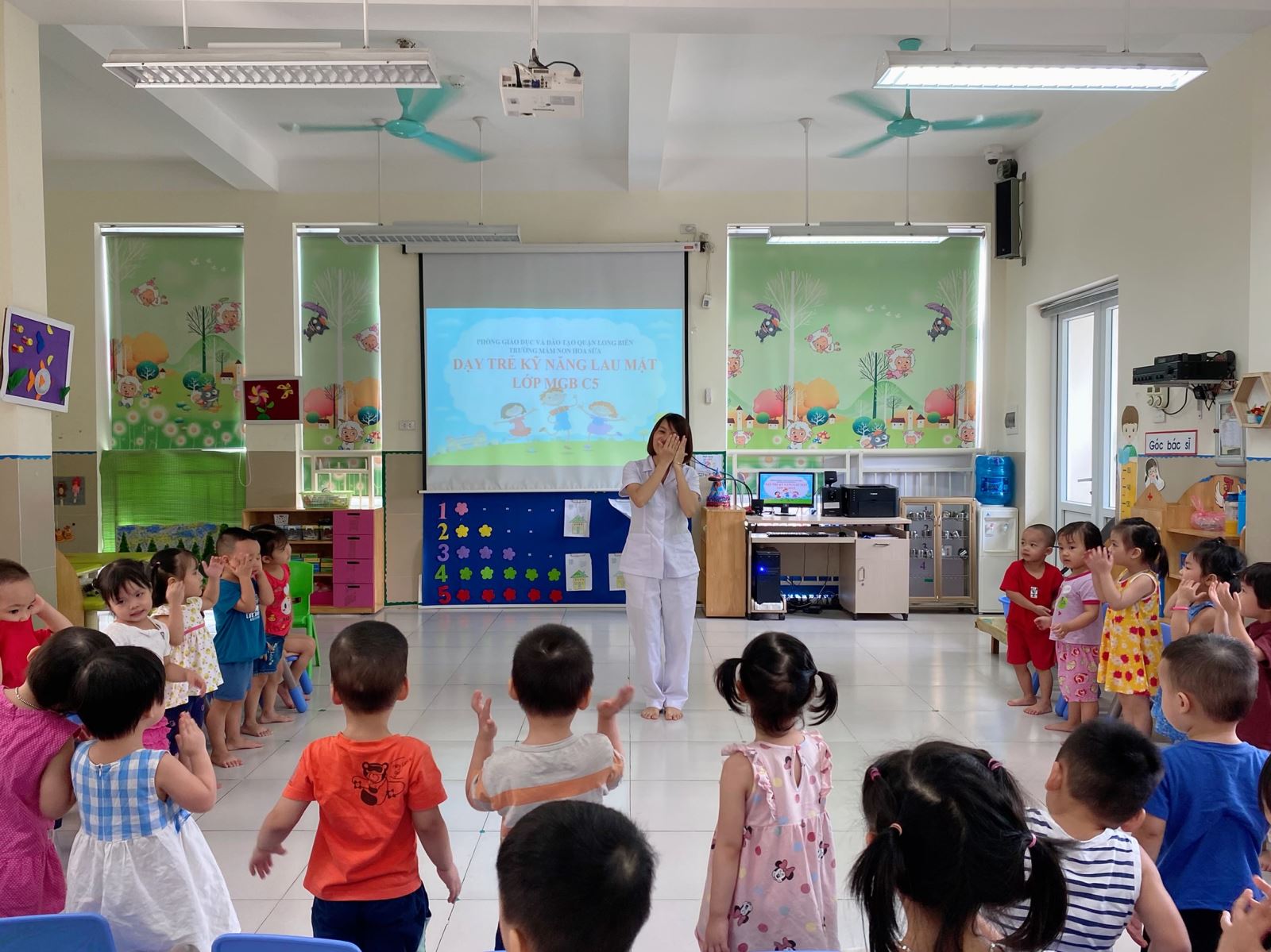 Song song với nhiều hoạt động ở lớp như hoạt động học, hoạt động vui chơi, các bé lớp mẫu giáo bé C5 trường mầm non Hoa Sữa được cô rèn các kỹ năng tự phục vụ bản thân như bê ghế, uống nước, úp cốc, rửa tay…và một trong những kỹ năng mà các bé rất thích khi được cô hướng dẫn đó là kỹ năng lau mặt.
