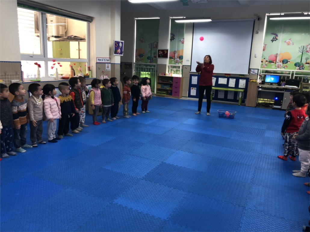 Đầu tiên, các con đã được khởi động đi vòng tròn trên nền nhạc bài Baby Shark cùng với các động tác. Sau đó là tập bài tập phát triển chung trên nền nhạc trống. Các con rất cố gắng tập theo các động tác với cô. Khi đã được vận động cơ thể khỏe hơn , các con cùng đến với vận động “ Tung và bắt bóng”. Các cô đã chuẩn bị những quả bóng, hướng dẫn động tác vừa phân tích các cô vừa thực hiện. Các con đã được vận động và rèn luyện với các quả bóng mà các cô đã chuẩn bị sẵn. Kết thúc buổi học các con cùng các cô tham gia trò chơi “ Chuyền bóng”. Với trò chơi này các con rất hứng thú chuyền bóng theo nhạc, cố gắng chuyền bóng về đích nhanh nhất. Các con đã có một buổi học rất thú vị!