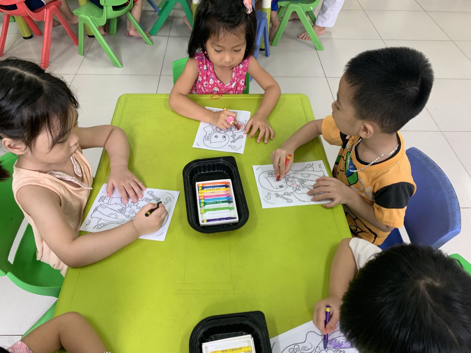 Mở đầu hoạt động là một bài hát”Cô giáo em”để tạo hứng thú cho các con.Vào hoạt động chính cô giáo cho các con xem một số hình ảnh về cô giáo,từ đó trẻ cảm nhận được hình ảnh,màu sắc và trang phuc,đồ dùng day học của cô giáo .Sau những hình ảnh sinh động nghề giáo viên,cô giáo đã đem đến một số bức tranh về các nghề giáo viên,trẻ được nhận xét về màu sắc,chất liệu,bố cục, của mỗi bức tranh.Các bé được suy nghĩ và nói lên ý tưởng của mình sẽ tô màu gì sử dụng chất liệu gì để trang trí cho bức tranh cô giáo của mình đẹp và sinh động hơn.Trẻ được về bàn tô màu,thỏa sức sáng tảo ra tác phẩm của mình.Các bé còn được cô giáo rèn kỹ năng cầm bút,tư thế ngồi và kỹ năng tô màu. Kết thúc giờ học cô giáo cho các bé lên nhận xét về các sản phẩm của mình và được khen các bé vô cùng hào hứng.