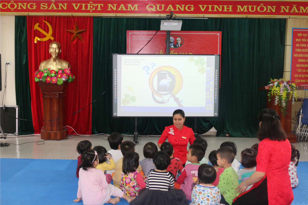 Mở đầu tiết học cô đã tạo sự hứng thú cho trẻ bằng cách đưa ra câu đố và khuyến khích trẻ tìm câu trả lời. Bên cạnh đó cô đã ứng dụng và đưa trẻ đến gần với các thiết bị công nghệ thông tin. Cô khuyến khích trẻ sử dụng kính lúp trong bảng tương tác để tìm ra câu trả lời đúng nhất trong câu đố của cô. Trẻ hợp tác rất tích cực và vui vẻ khi được cô động viên khen ngợi.
