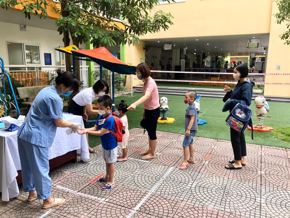 Trước khi trẻ quay trở lại trường, các bác, các cô đã tạo nên một môi trường xanh-sạch-đẹp, an toàn, thân thiện từ cổng trường, sân chơi cho tới các lớp học trong tiếng nhạc rộn ràng. Khi vào cổng trường, phụ huynh học sinh được các bác bảo vệ và đồng chí công an phường Sài Đồng hướng dẫn để xe đúng quy định. Nhà trường tổ chức đo thân nhiệt và sát khuẩn tay khô cho CBGVNV, phụ huynh và trẻ tại 4 điểm đã được ghi cụ thể trong phương án và gửi tới phụ huynh học sinh. Tại các điểm đo, các đc CBGVNV được phân công hướng dẫn phụ huynh và trẻ đứng giãn cách theo vạch sơn trắng, đeo khẩu trang, đo thân nhiệt và sát khuẩn tay trước khi phụ huynh đưa trẻ lên lớp. Các con còn được cô giáo đo thân nhiệt lần 2 và vào sổ theo dõi sức khỏe tại lớp. Bé nào cũng vui vẻ, hồn nhiên vào lớp chào cô giáo, chào các bạn và hứng thú với những món đồ chơi yêu thích. Để tránh tập trung đông người, các con tập thể dục sáng tại lớp mình, được tham gia các hoạt động học tập, vui chơi tại lớp và được phân thời gian hoạt động ngoài trời để đảm bảo an toàn và bạn nào cũng được ra ngoài trời để hít thở không khí trong lành. Trong các giờ vệ sinh, cô giáo hướng dẫn các con thao tác rửa tay 6 bước với xà phòng, lau tay bằng giấy khô và lau mặt sạch sẽ. Đến giờ ăn, các con lại được ăn những món ăn yêu thích do các cô nuôi dưỡng chế biến, phù hợp với khẩu vị, bé nào cũng ăn ngon miệng, ăn hết suất.