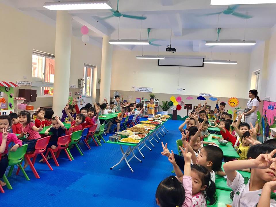 Tiệc Buffet là hình thức ăn uống tự phục vụ tự do và phong phú nhất, nhằm tạo nên sự thoải mái trong thói quen ăn uống của bé. Tổ chức tiệc Buffet là một hình thức thay đổi trong cách ăn, cách thưởng thức các món ăn khác nhau cho trẻ. Việc tổ chức cho trẻ ăn Buffet trước hết giúp trẻ được thưởng thức các món ăn vừa lạ vừa quen, giúp trẻ hiểu thêm những nét đẹp trong văn hóa ẩm thực của người Việt. Các món ăn trong bữa tiệc đều được các bác, các cô nuôi dưỡng tự tay chuẩn bị và trình bày đẹp mắt, hấp dẫn. Thông qua bữa tiệc Buffet phát triển cho bé các kỹ năng trong ăn uống như: học cách tự phục vụ bản thân, tự do lựa chọn những món ăn mà các bé thích, biết sử dụng các dụng cụ ăn uống.