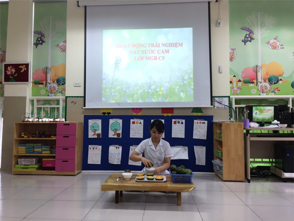 Cam là loại quả khá quen thuộc của rất nhiều bạn nhỏ nhưng để làm ra được một cốc nước cam thơm mát và ngon thì nhiều bạn nhỏ vẫn chưa biết. Qua hoạt động trải nghiệm, trẻ biết được các nguyên liệu của đồ uống này gồm: cam, đường và dụng cụ hỗ trợ các bé là bộ vắt nước cam. Bạn nhỏ nào cũng thích thú khi cùng nhau trải nhiệm hoạt động vắt nước cam và nếm thành quả của mình: