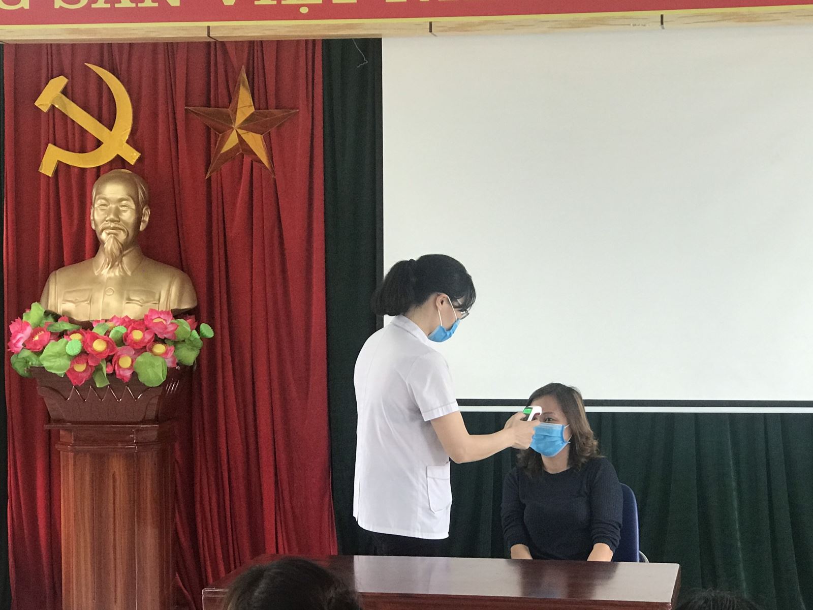 Ban giám hiệu tổ chức buổi họp đầu giờ với đội ngũ cán bộ chủ chốt để tiếp tục triển khai công việc, phân công nhiệm vụ cho các bộ phận chuẩn bị kỹ lưỡng cho việc đón học sinh đi học trở trường học. Trong buổi họp, nhân viên y tế hướng dẫn GVNV sử dụng dụng cụ đo thân nhiệt để các cô nắm chắc quy trình khi tiến hành đo trên trẻ.