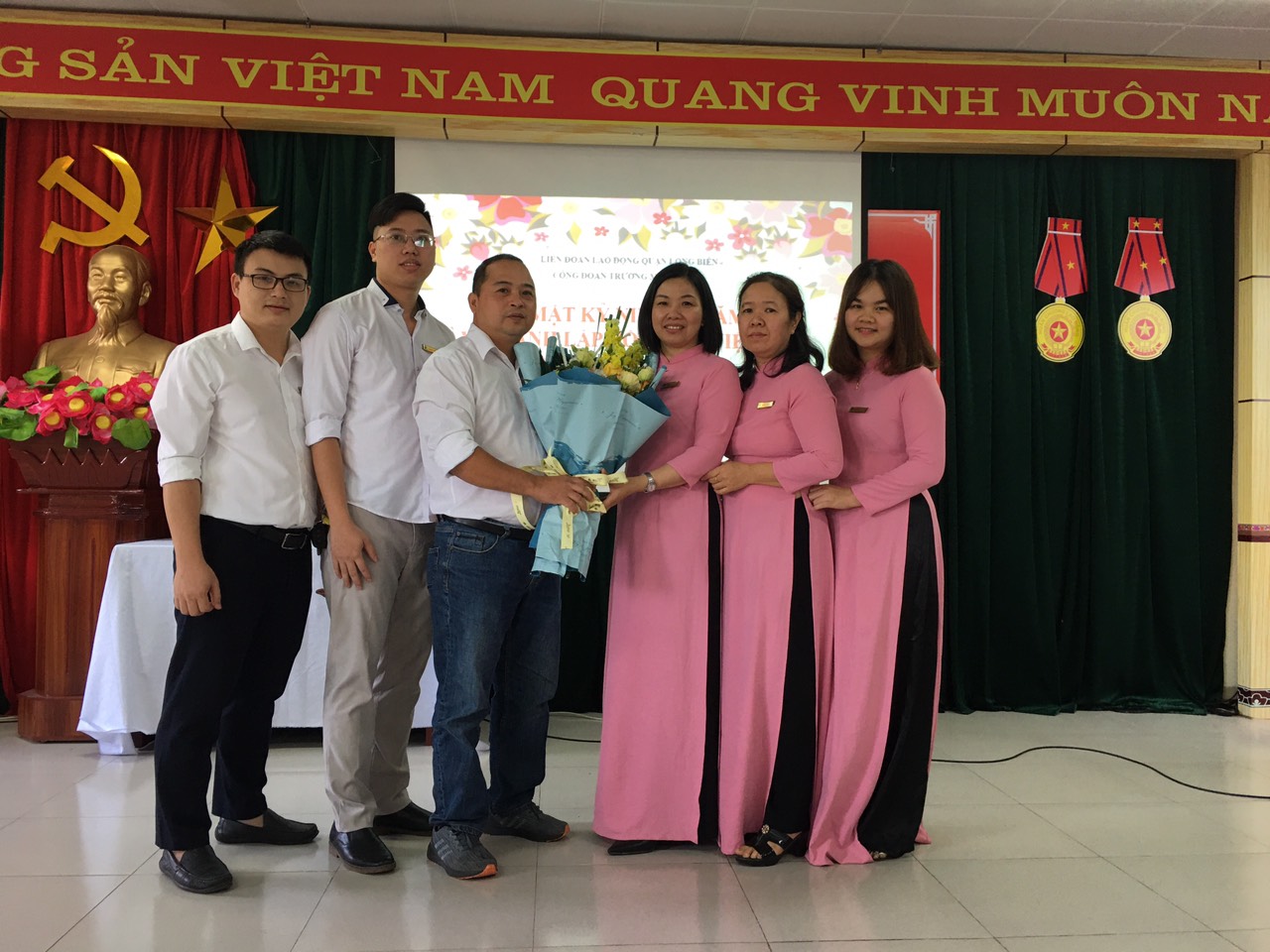 Trong không khí vui mừng của ngày thành lập Hội liên hiệp Phụ nữ Việt Nam, các đồng chí nam giới nhà trường đã tặng bó hoa tươi thắm tới toàn thể chị em trong trường những lời chúc tốt đẹp nhất. Những lời chúc đó đã tiếp thêm sức mạnh cho chị em, giúp các chị em có thêm động lực để tiếp tục phấn đấu. rèn luyện hơn nữa.