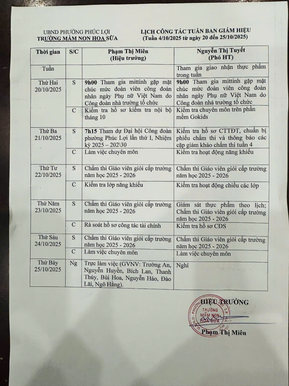 Lịch BGH tuần 4 tháng 10 năm 2025